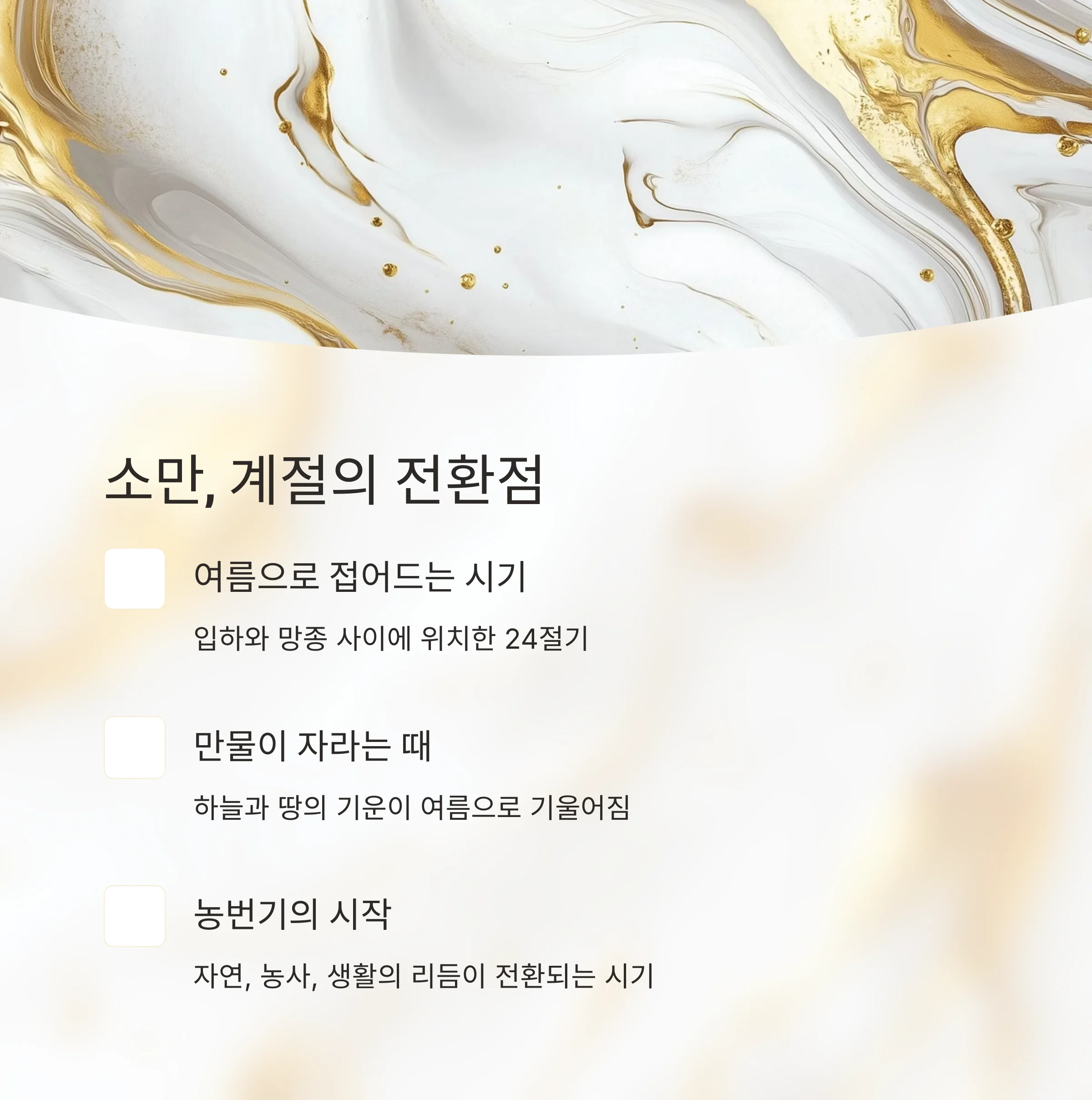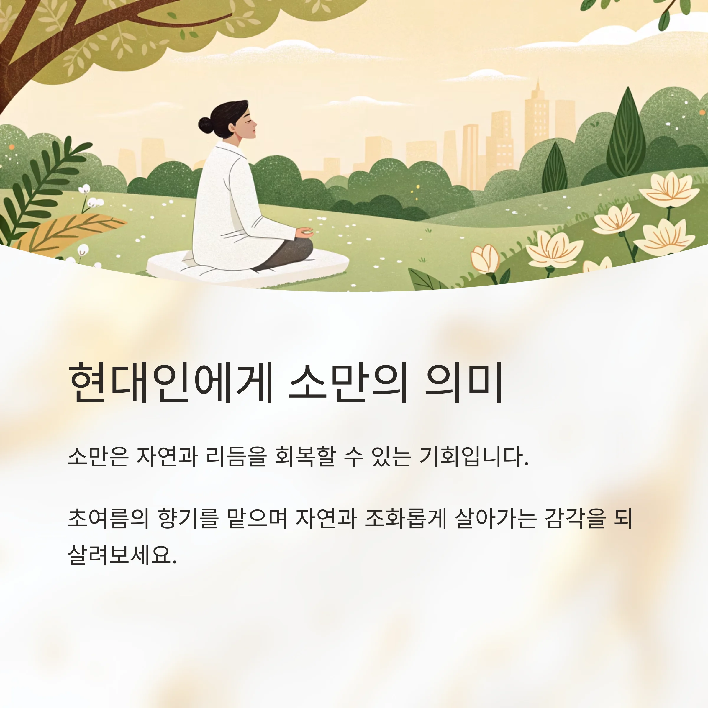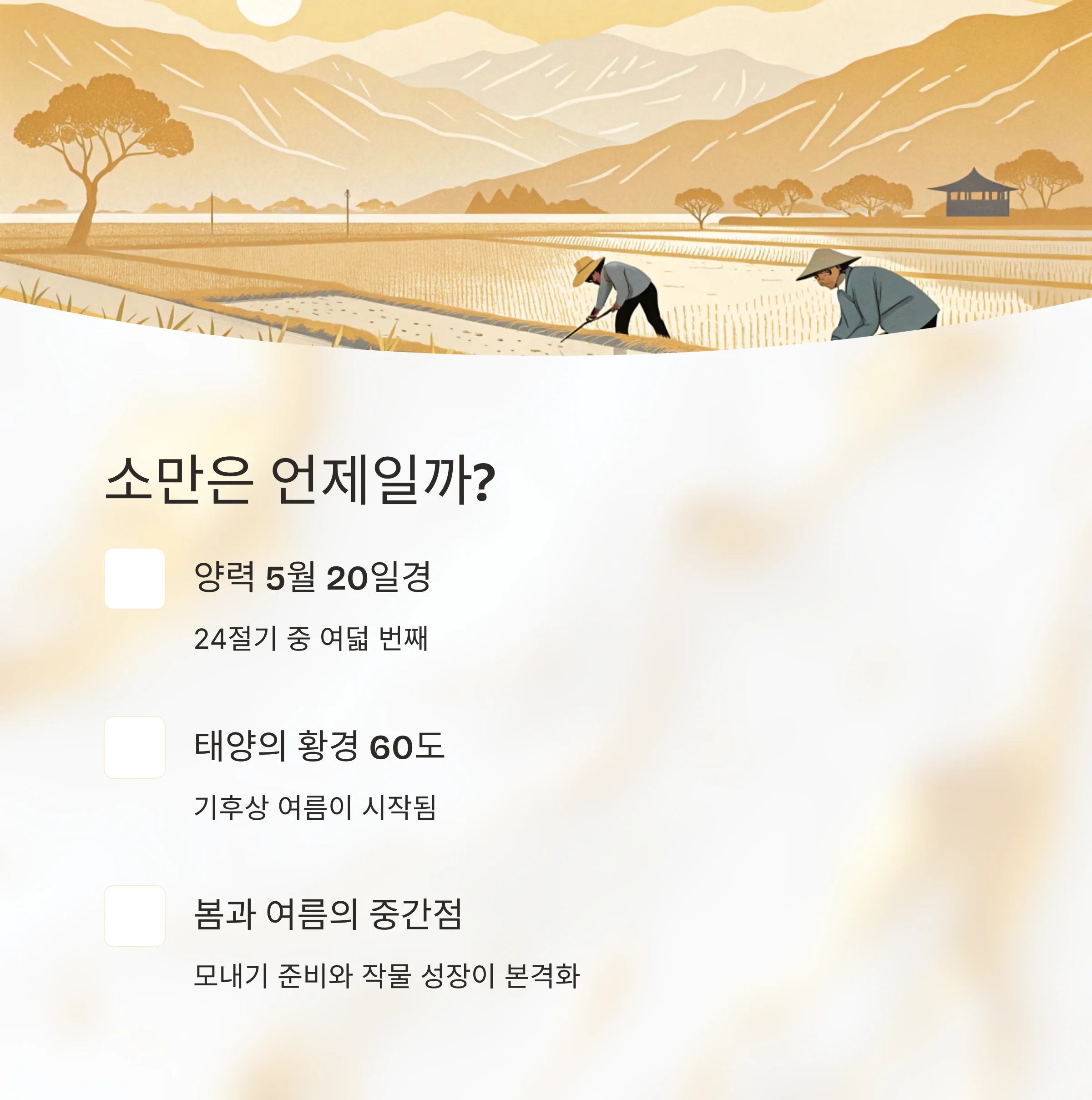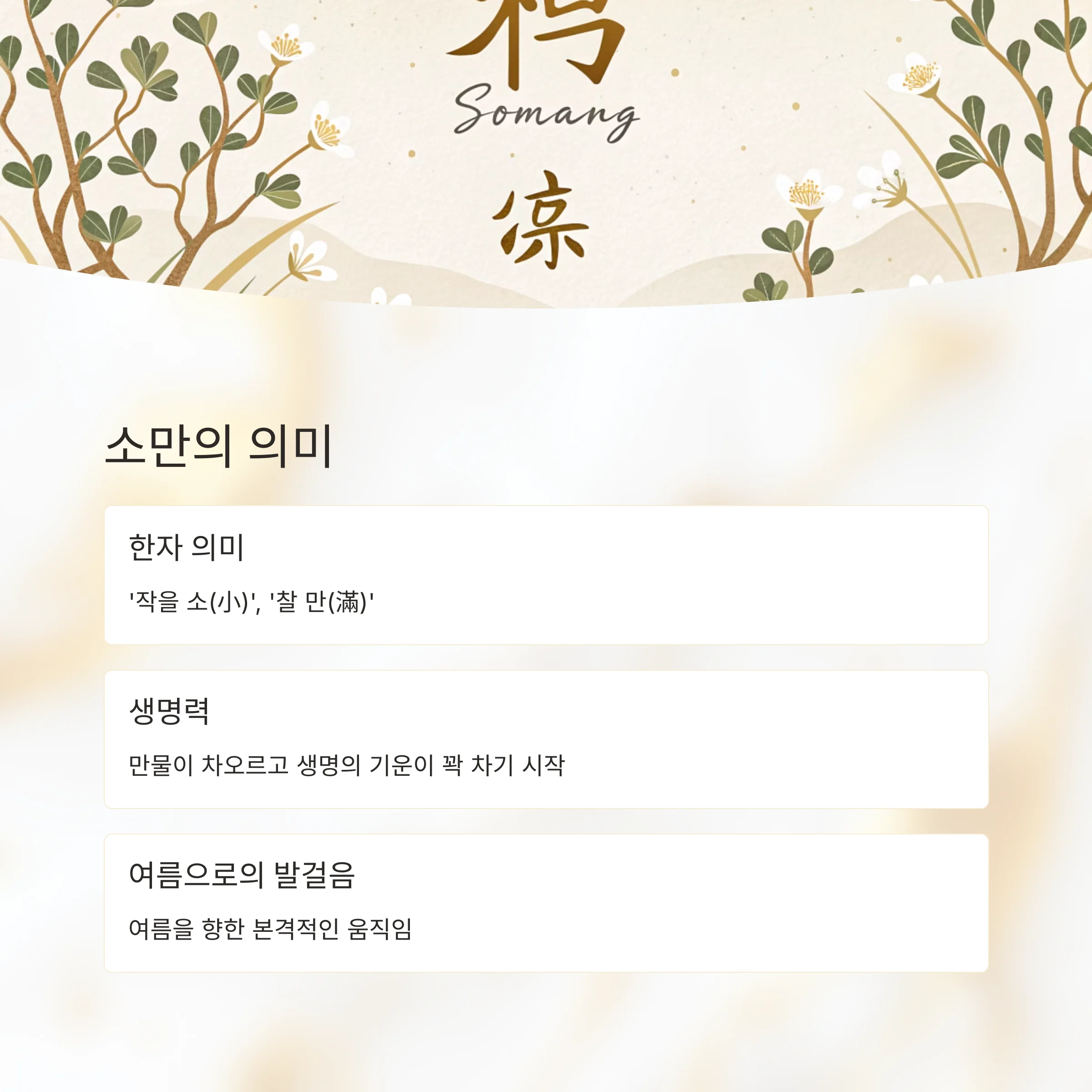 소만은 본격적인 여름으로 접어드는 시기의 24 절기로, 입하와 망종 사이에 위치한 계절의 전환점입니다.