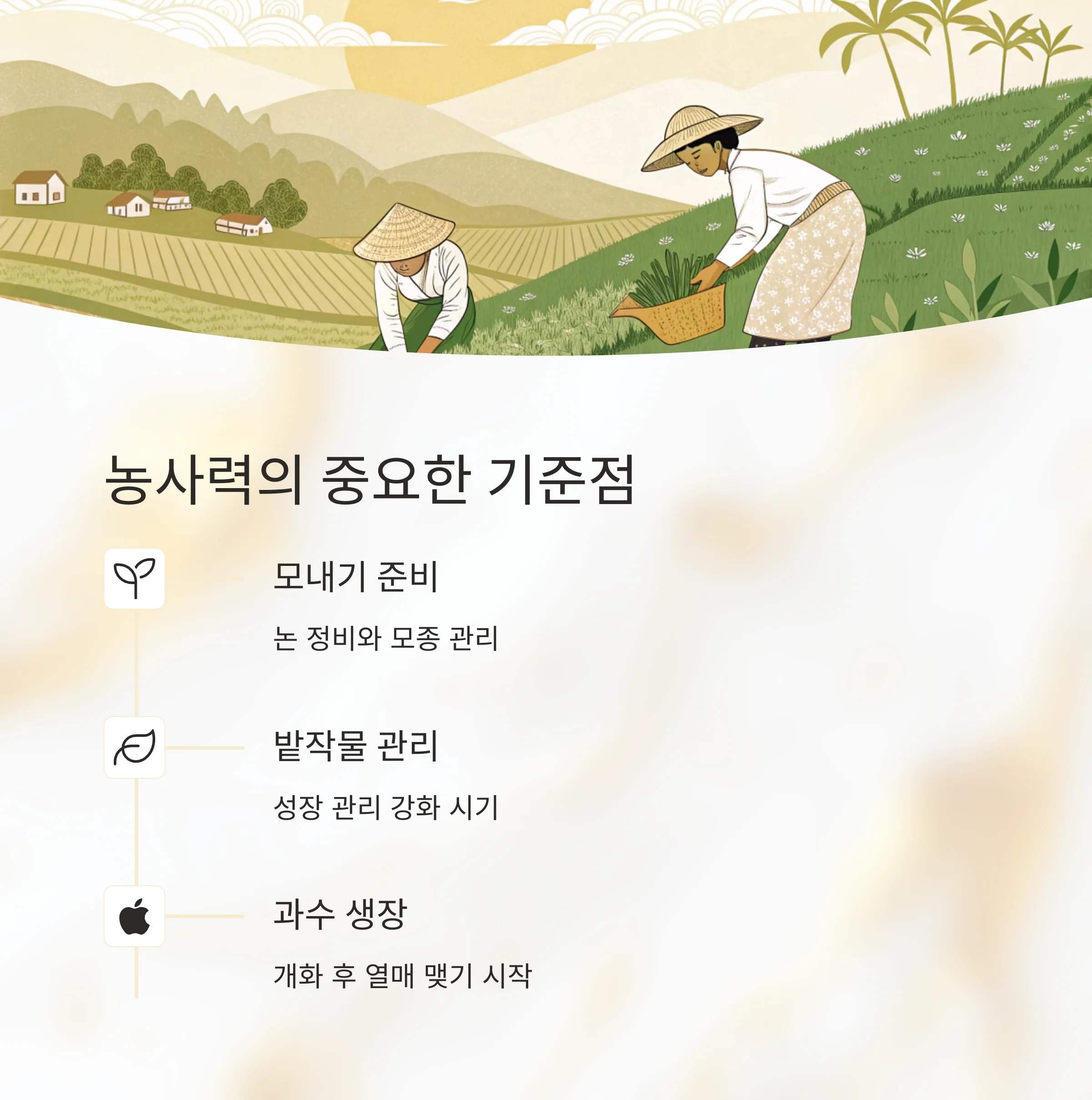 농촌에서는 모내기를 준비하고, 과수와 밭작물의 성장도 본격화되는 시기입니다.