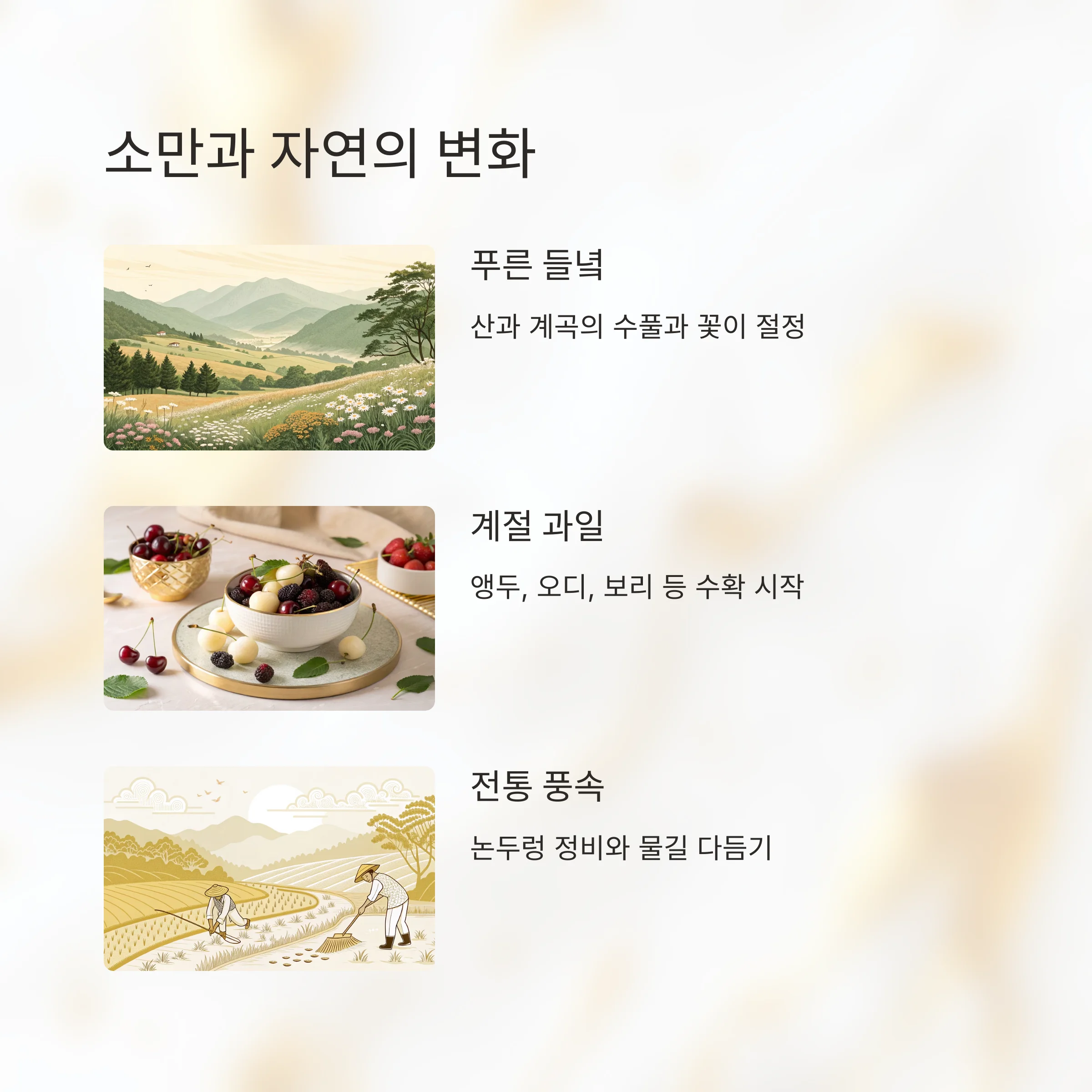 입하는 여름의 시작, 망종은 곡식을 심는 본격적인 농사의 시작이라면, 소만은 이 둘을 이어주는 중심 역할입니다.