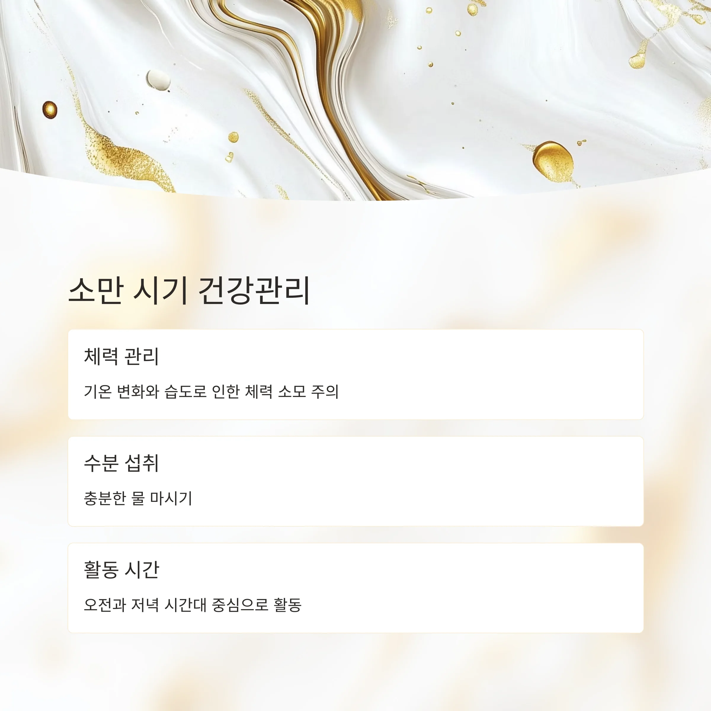 | 수분 섭취 | 충분한 물 섭취 |