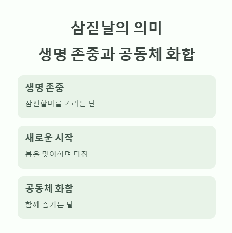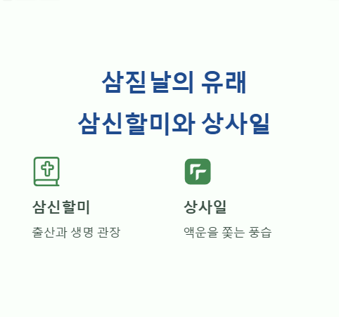 삼신(三神)은 인간의 출산과 생명을 관장하는 신으로 여겨졌으며, 삼짇날은 이들을 기리는 날이었다고 전해집니다.