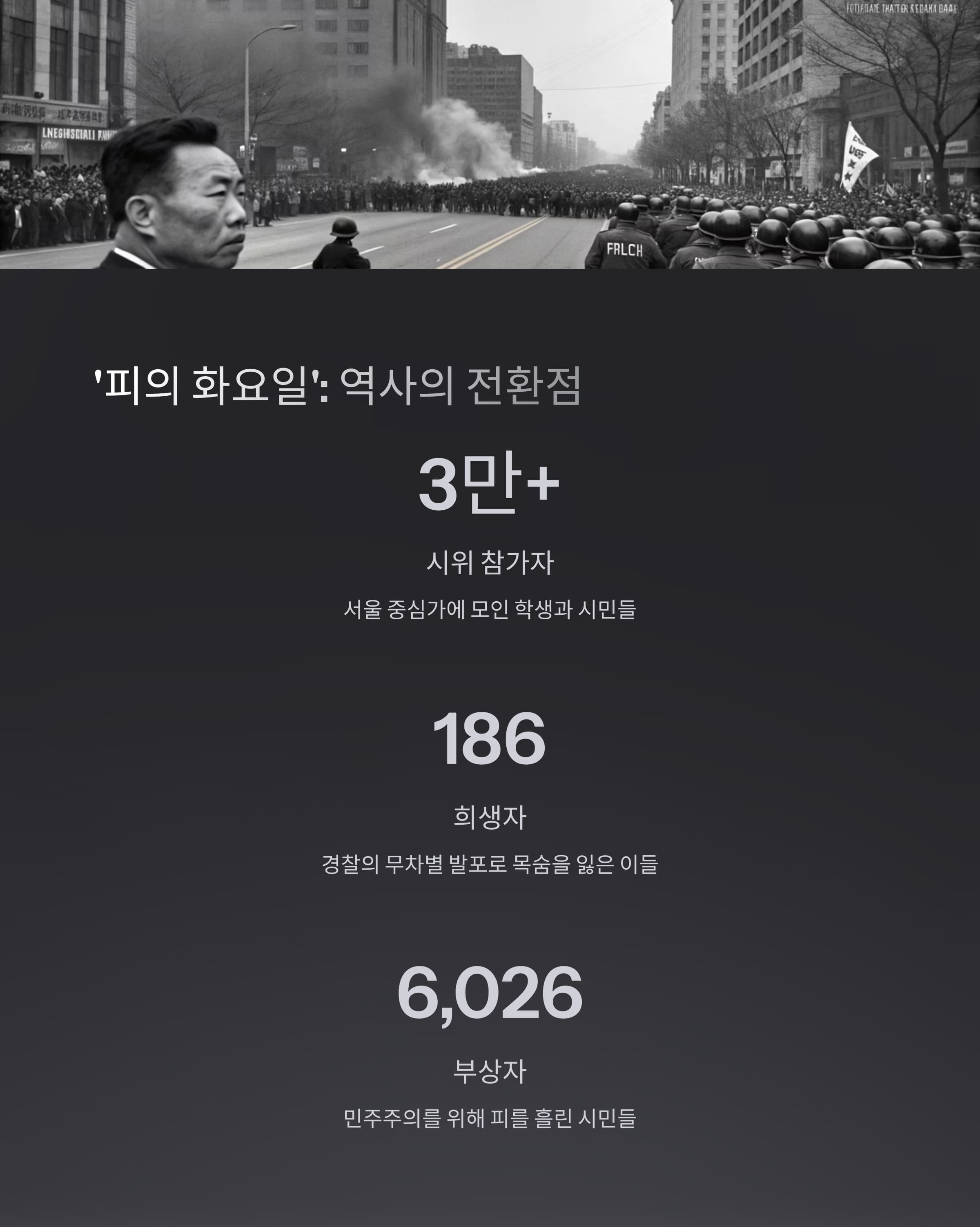 | 4.19 혁명 희생자 수 | 사망자 186명, 부상자 6,026명으로 기록됩니다. |