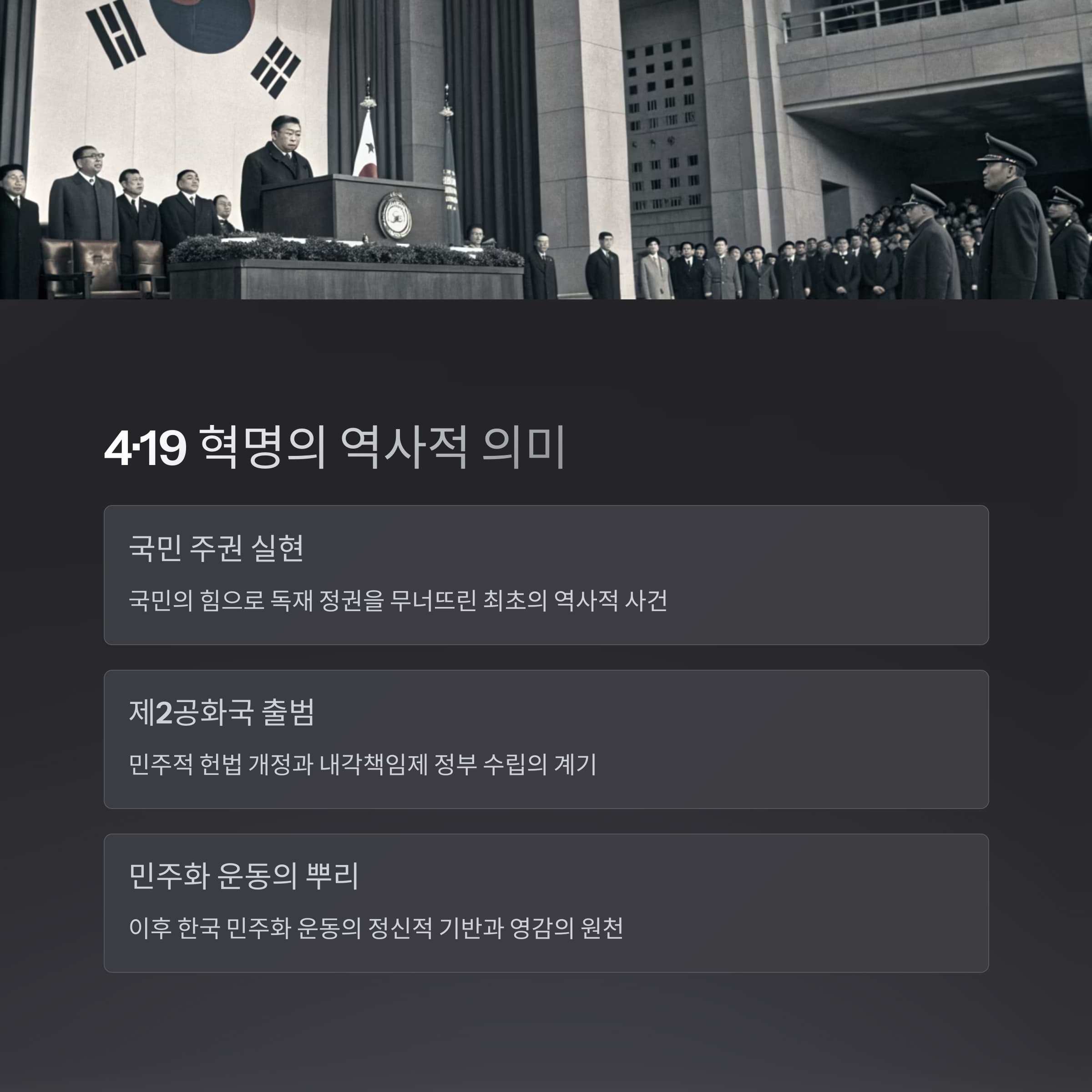 4.19 혁명은 단순한 과거의 사건이 아니라, 우리가 오늘날 누리는 자유의 밑거름이 된 숭고한 희생의 결과입니다.