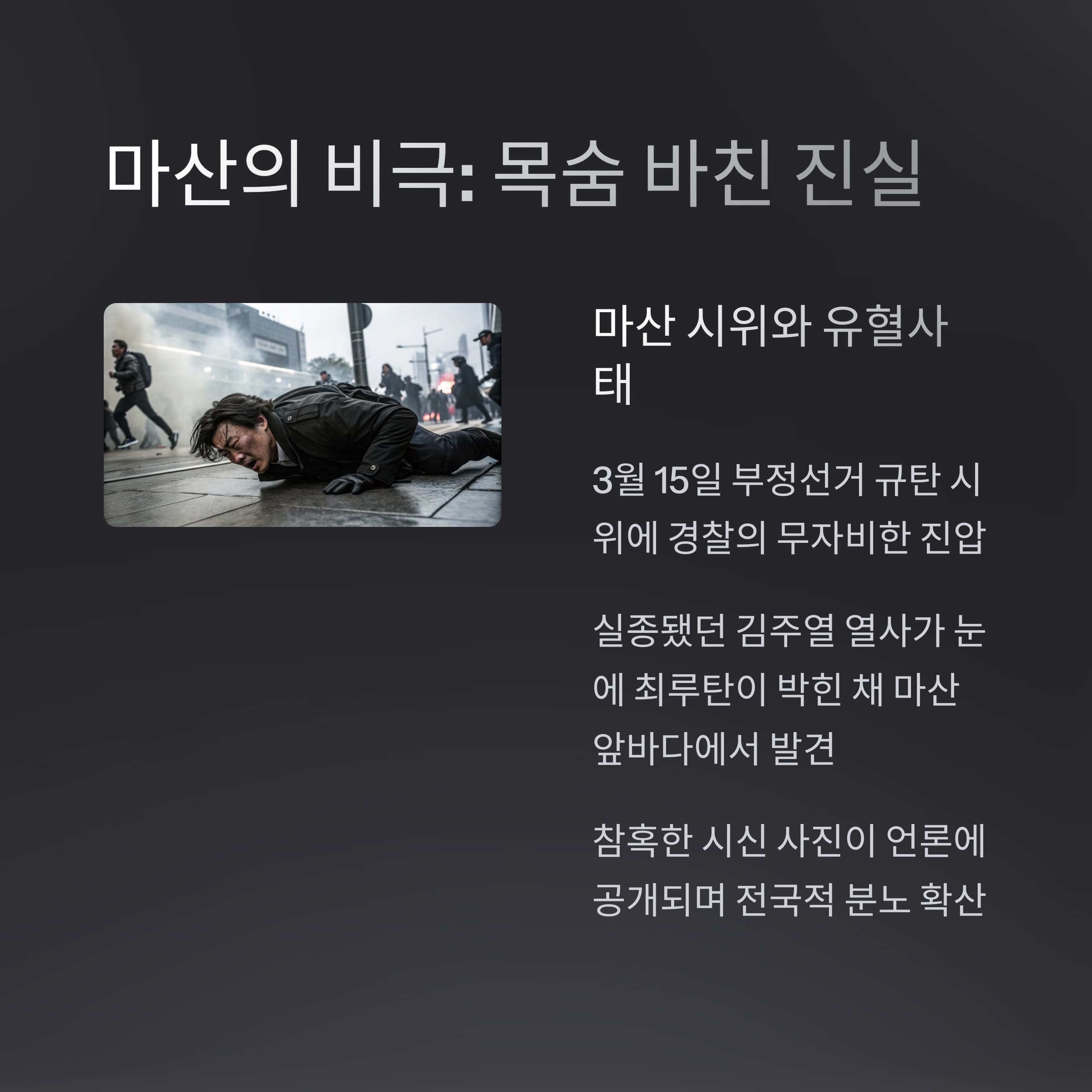 3.15 부정선거에 분노한 학생들과 시민들은 거리로 나섰고, 그들의 외침은 곧 전국으로 퍼져나갔습니다.