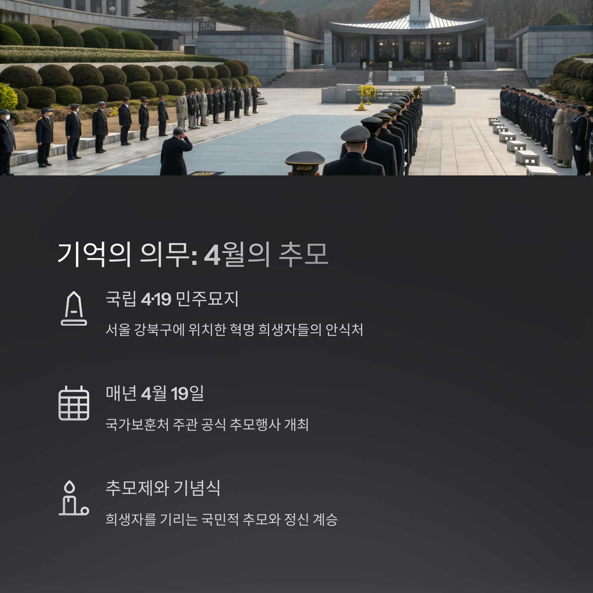 | 대한민국 민주주의를 위한 희생 | 한국 근현대사의 중요한 전환점 | 매년 4월 18일 추모 행사 개최 |