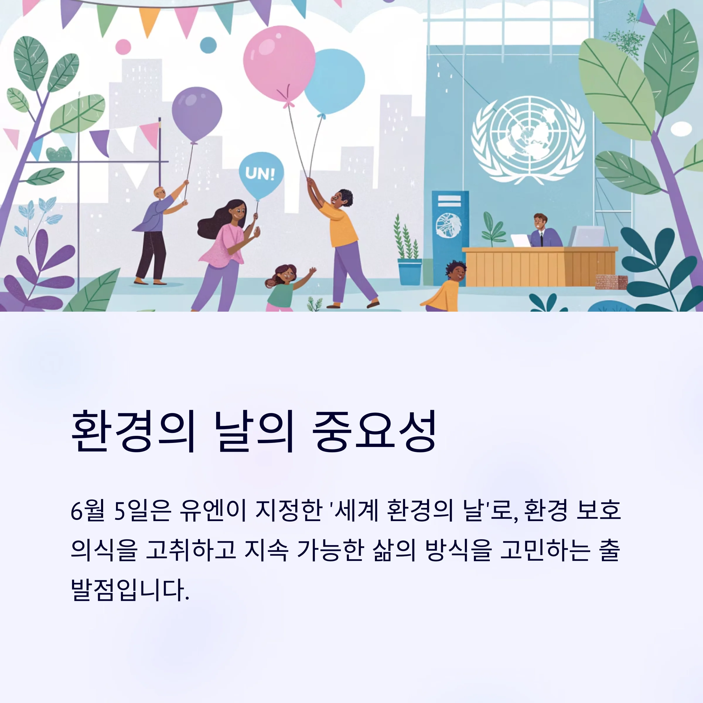 6월 5일은 유엔이 지정한 '세계 환경의 날'로, 전 세계적으로 환경 보호에 대한 의식을 고취하고 실천을 촉구하기 위한 날입니다.
