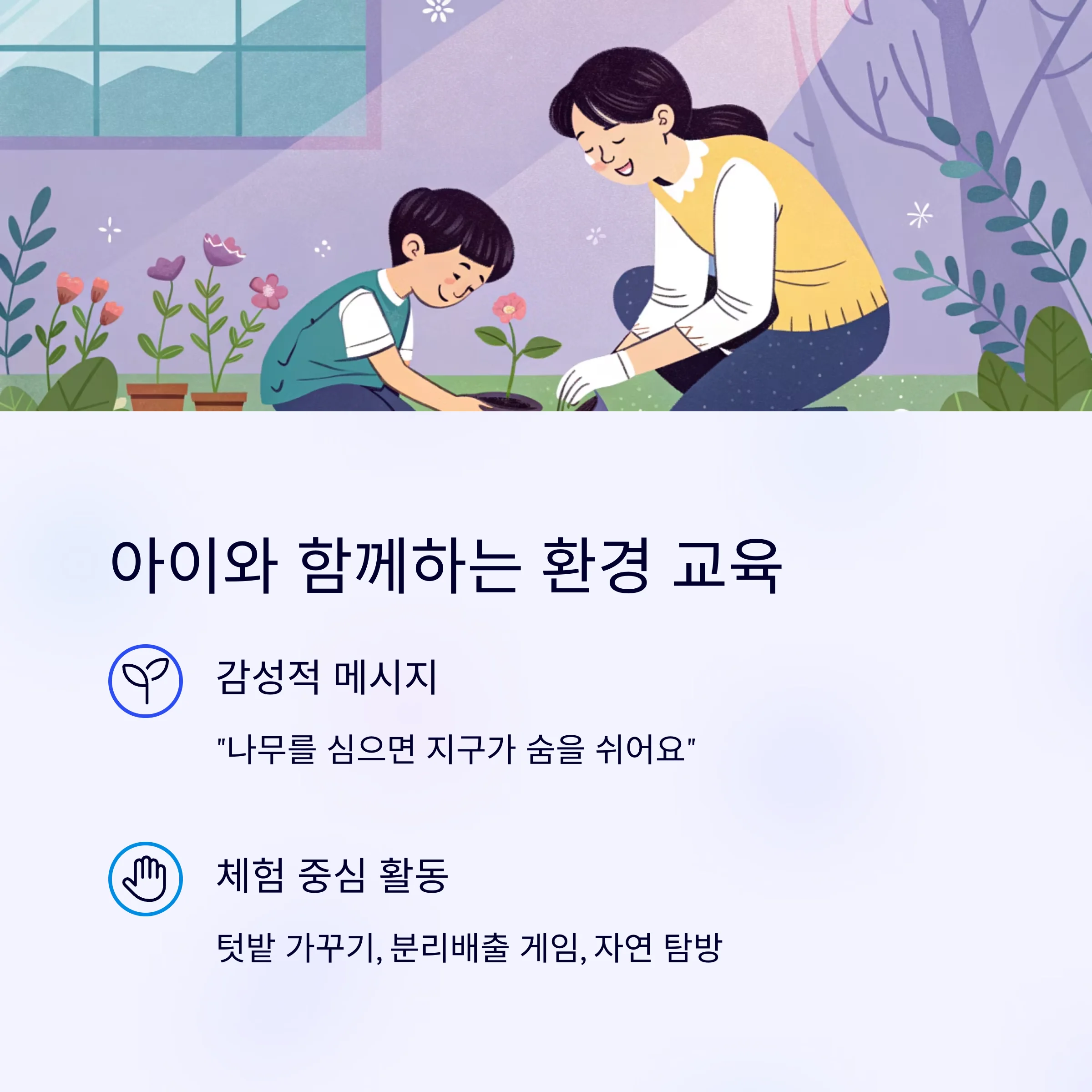 예를 들어, 텃밭 가꾸기, 분리배출 게임, 자연 탐방 등은 자연을 몸으로 느끼며 배우는 효과적인 방법입니다.