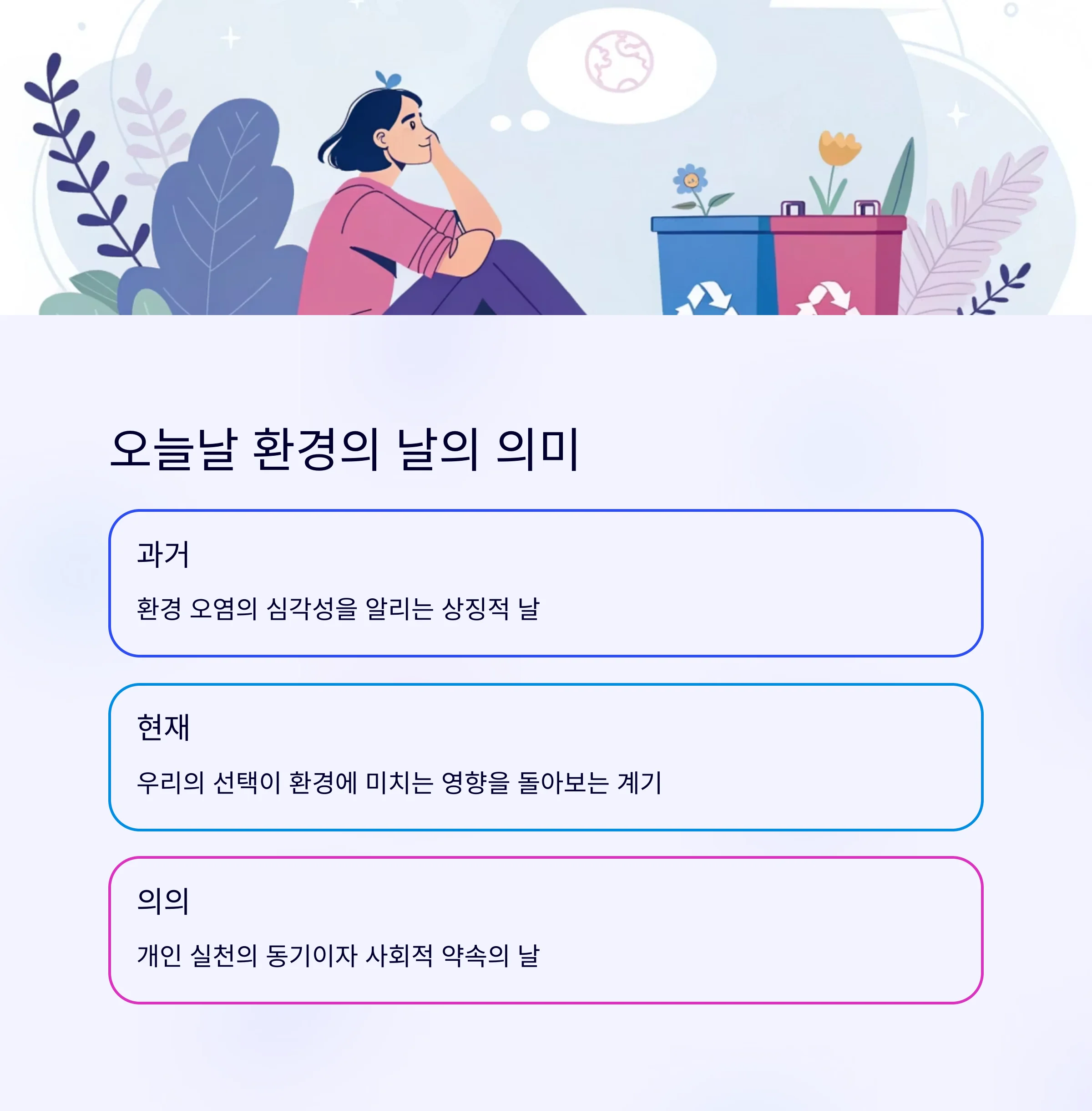 과거에는 환경 오염의 심각성을 알리는 상징적인 날이었다면, 오늘날에는 "우리의 선택이 환경에 미치는 영향" 을 직접 돌아보는 계기가 됩니다.