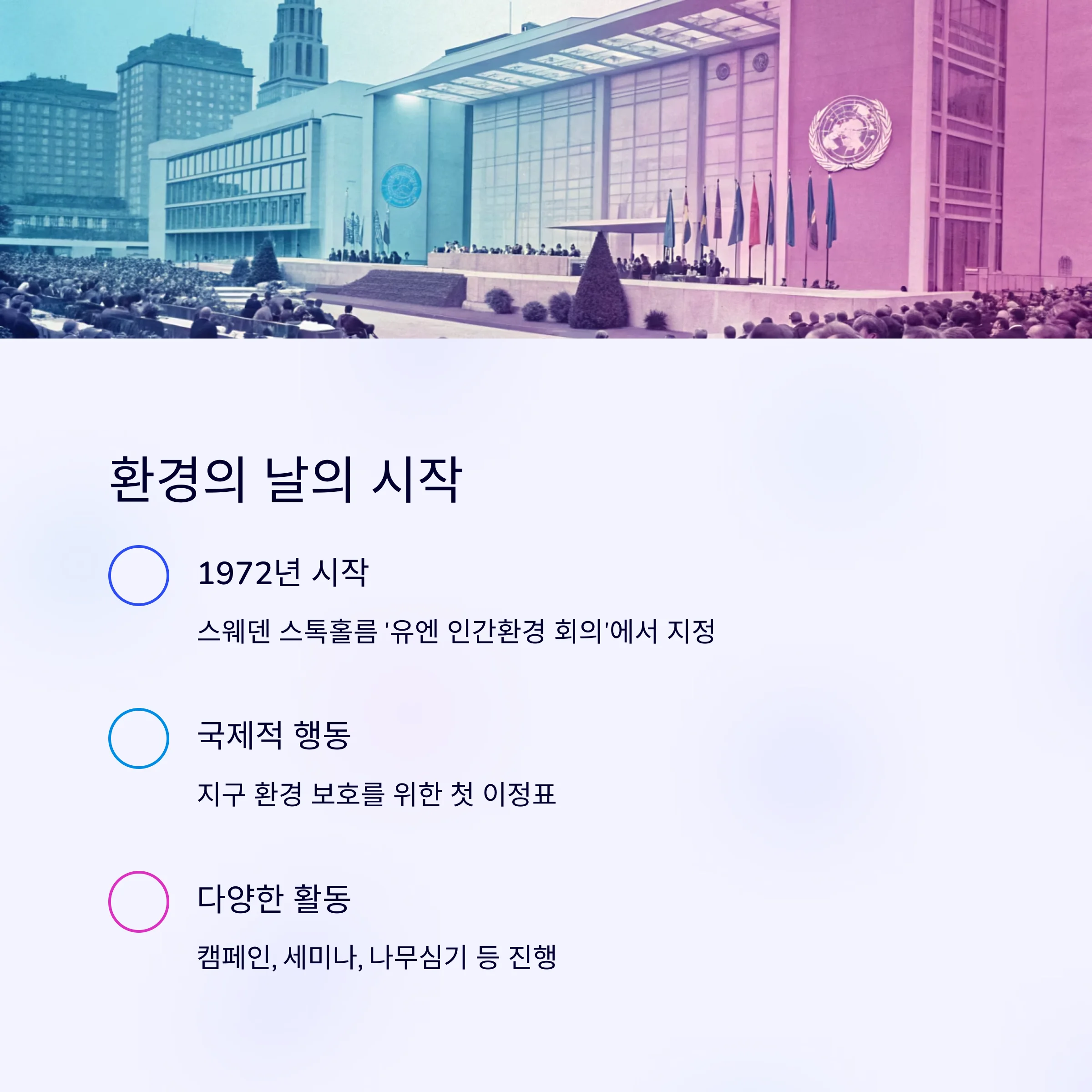 1972년 스웨덴 스톡홀름에서 열린 '유엔 인간환경 회의'에서 6월 5일을 ‘세계 환경의 날’로 지정한 것이 시작입니다.